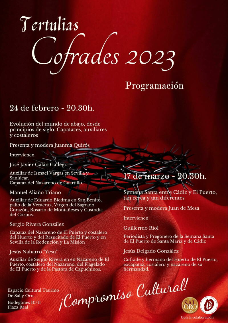 Viernes 24 de febrero 20.30h. Organiza: Juanma QuirósPresenta y modera: Juanma Quirós Evolución del mundo de abajo desde principios de siglo.Capataces, auxiliares y costaleros.Intervienen José Javier Galán GallegoAuxiliar de Ismael Vargas en Sevilla y Sanlúcar.Capataz del Nazareno de Cuartillo. Manuel Aliaño TrianoAuxiliar de Eduardo Biedma en San Benito, palio de la Veracruz, Virgen del Sagrado Corazón, Rosario de Montañeses y Custodia del Corpus. Sergio Rivera GonzálezCapataz del Nazareno de El Puerto y costalero del Huerto y del Resucitado de El Puerto y en Sevilla, de la Redención y La Misión Jesús Navarro "Yesu"Auxiliar de Sergio Rivera en el Nazareno de El Puerto, costalero del Nazareno, del Flagelado de El Puerto y de la Pastora de Capuchinos. Viernes 17 de marzo 20.30h.Organiza: Juanma QuirósPresenta y modera: Juan de Mesa Semana Santa entre Cádiz y El Puerto, tan cerca y tan diferentes. Intervienen Guillermo RiolPeriodista, pregonero de la semana santa de El Puerto de Santa y de Cádiz Jesús Delgado GonzálezCofrade y hermano del Huerto de El Puerto, excapataz, costalero y nazareno de su hermandad.