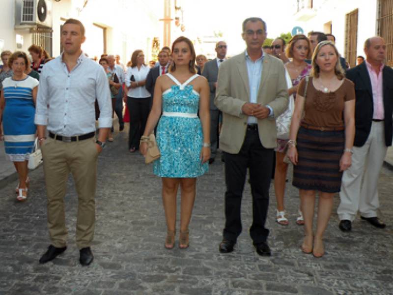 En la ribereña localidad Sevillana de Alcalá del Rio, se celebró a las 8´30 la procesión matinal del Santo Patrón de los alcalareños, Doctor de la Iglesia, vecino de la villa y alcalde perpetuo de la localidad. La Procesión partió desde la Real Ermita de San Gregorio de Osset, templo donde radica sus cultos y de las Hermandades de Penitencia de Vera-cruz y Soledad, hasta la parroquia de Sta. María de la Asunción, para la celebración de la Novena en su Honor, con motivo de sus ferias y fiesta. Esta Ermita fue edificada por San Fernando y dedicada por los Reyes Católicos en 1460. Esta procesión matinal se hizo el Domingo 26 de Agosto del 2012, en rosario penitencial, por decisión parroquial, para que el pueblo alcalareño (Ilípense), en estos momentos de tantas dificultades, de graves problemas para muchas familias, para que San Gregorio, ayude y tienda una mano a los que menos tiene, y aquellas personas cuyas casas se ven azotada duramente por el fantasma del paro, para que los ilumine para poder tener la capacidad juiciosa de obrar acertadamente en beneficio de los demás. Abriendo la procesión la cruz parroquial con dos ciriales, seguido de fieles y devotos. A continuación, acompañando por una amplia representación del equipo de gobierno del Municipio, encabezado por su alcalde, Antonio Campo Ruiz, además de representantes de las Hermandades y Cofradías de la localidad, así como numerosos fieles y devotos. Presidiendo en el paso del Santo Patrón el Padre Fernando Reyes Rico, párroco de la Santa Iglesia Parroquial de Santa María de la Asunción, que rezaba el rosario y oraciones, con la feligresía por medio de megafonía. La procesión estaba organizada en esta ocasión por la Real Hermandad de la Soledad, que llevaron el paso de San Gregorio, con una cuadrilla de costalero del paso del triunfo de la Santa Cruz (paso de la canina), al mando del martillo José Miguel Cabrera y Rubén López Velazco con sus auxiliares. El exorno floral fueron nardos, claveles, lifiantus y gladiolos, todas flores blanca, simbolizando la pureza que corresponde a un santo. Cerraba la procesión los feligreses y devotos detrás del paso en grupo sin orden determinado. Fotografía Antonio Rendón Domínguez.