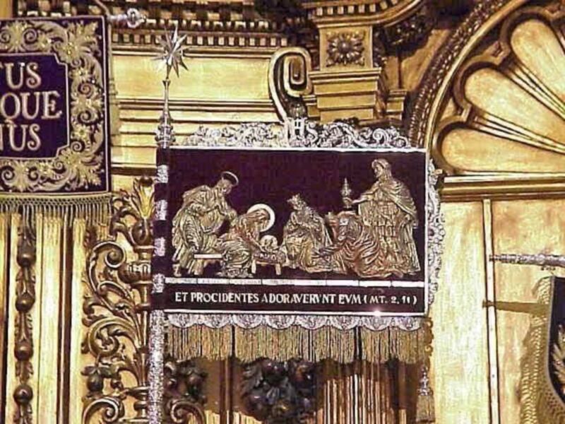 En cuanto a la insignia del Guión de la Epifanía , por ambas caras, representa el pasaje evangélico de la adoración de los Reyes Magos , en un altorelieve de plata policromada con la leyenda : "ET PROCIDENTES ADORAVERUNT EUM". ( Mat 2,I-12 ) . En el reverso la Estrella de Oriente y la leyenda :