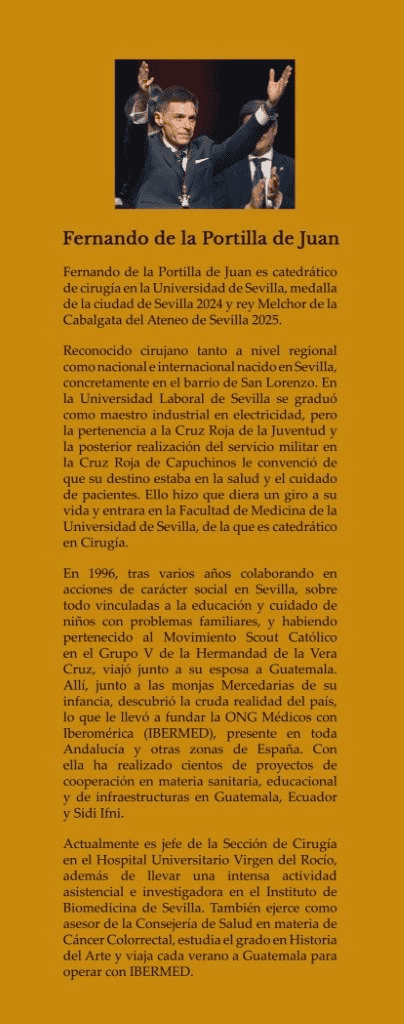 Fernando de la Portilla de Juan es Catedrático de la Universidad de Sevilla de Cirugía, y vicerrector de la Facultad de Medicina Hispalense . Jefe de la Unidad Coloproctología del Hospital Universitario Virgen del Rocío. Académico Correspondiente de la Real Academia de Medicina y Cirugía de Sevilla. Medalla de Sevilla 2024. Rey Melchor 2025. Es hermano de la Vera Cruz y del Buen Fin.