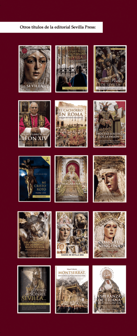 Siguió con ‘Gran Poder de Sevilla: Crónica de la Santa Misión’, de varios periodistas y escritores sevillanos; ‘Mi Cristo Roto’, también del Padre Cué; ‘Cómo sigue llorando Sevilla…’, de Francisco Correal; ‘Trilogía Sevillana del Padre Cué; ‘Teoría y Realidad de la Semana Santa de Sevilla’, de Antonio Núñez de Herrera, miembro de la Generación del 27 que relata la semana santa de la segunda república; “Magna de Sevilla 2024”; ‘Esperanza Macarena, Rosa de Oro’, del Doctor en Derecho Penal Juan Antonio Martos Núñez; ‘Así fue la Magna de Sevilla’; ‘Setefilla en la Magna de Sevilla’; ‘Relato médico de la Pasión, según Sevilla’ del doctor Fernando de la Portilla y siete médicos más; ‘El Cachorro en Roma’; ‘Esperanza Coronada de Málaga en Roma’; “¡Viva la esperanza de Triana! del padre Ramón Cue; “La esperanza de Triana en el Polígono Sur “; “Montserrat histórica peregrinación “, “Como tu Ninguna” recopilación de los textos históricos más interesa de la Semana Santa sevillana, dedicado a la Macarena tras su reciente restauración; el “Pregón de la Semana Santa de Sevilla de 1956 de Antonio Rodríguez Buzón, y “Regreso de los Javieres a los Jesuitas “ así como dos libros sobre el Papa León XIV, ‘Diez crónicas de urgencia sobre el nuevo Papa’ y ‘De mensajero peruano a Santo Padre’.., que visitara el próximo mes de junio España.