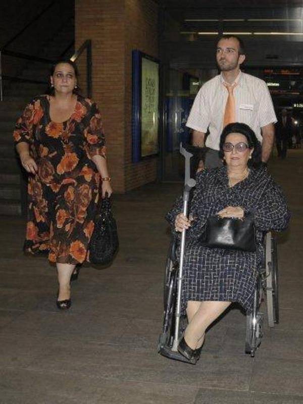La cantante solicitó ayuda para desplazarse en silla de ruedas a su llegada a la estación de Santa Justa. Se produjo también una simpática imagen familiar ya que coincidieron las tres generaciones de la familia, su hija Montsita viajó con su hija Daniela, de sólo un mes, que nació el pasado 3 de septiembre y que es la primera nieta de la soprano y su marido Bernabé.