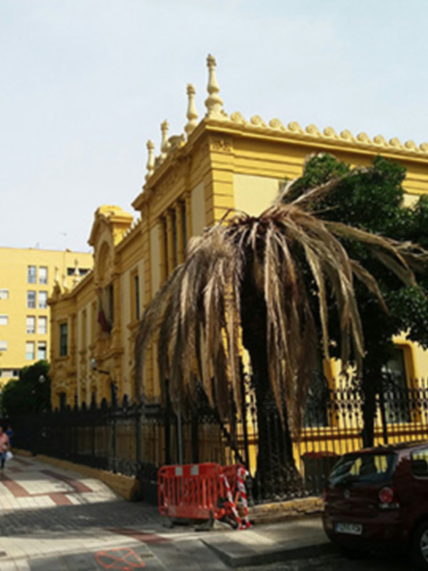 En la foto se puede ver un ejemplar de Phoenix canariensis en María Auxiliadora, que ha sido afectado por la plaga del Picudo que en Sevilla ha acabado con decenas de palmeras canarias. Es muy importante la prevención, las medidas profilácticas, el tratamiento y cuando hay un ejemplar muerto, rápidamente eliminarlo para que no sea un foco de infección para las palmeras del entorno. Estas actuaciones requieren de una gestión integral de las zonas verdes púbicas y de una coordinación de los servicios públicos con los particulares que tienen este problema.
