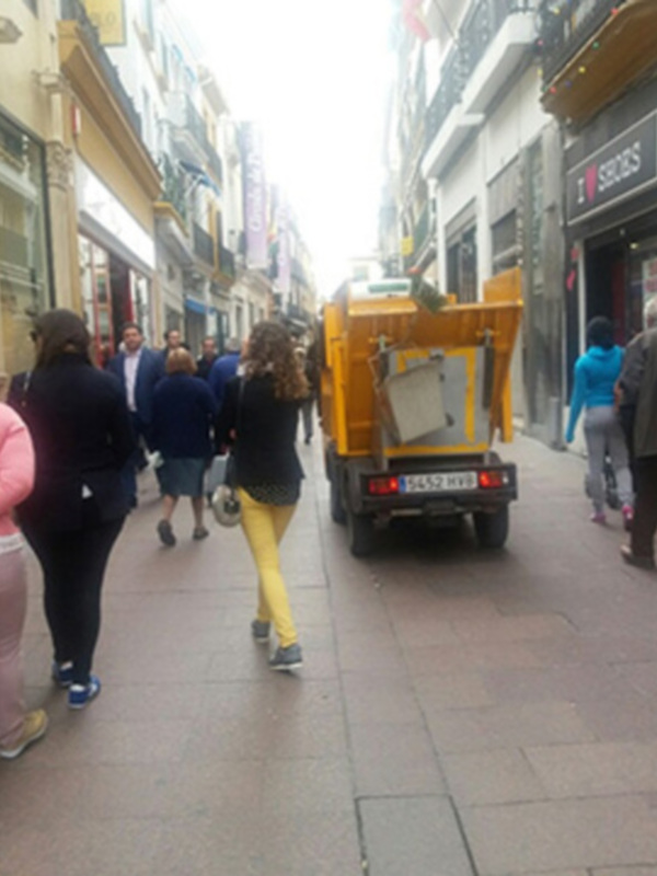 Llama la atención ver a una máquina barredora en calles peatonales del centro de Sevilla, intentado hacer su trabajo de limpieza, en horas que hay mucho público por la calle. En primer lugar es un riesgo para los peatones y en segundo lugar la máquina no puede hacer bien su trabajo porque tiene que pararse continuamente para no atropellar a los peatones. Estas tareas que generan riesgo y ruido (contaminación acústica) para los ciudadanos, se deben hacer en horarios de mínima afluencia de público y siempre con la máxima seguridad para los peatones.