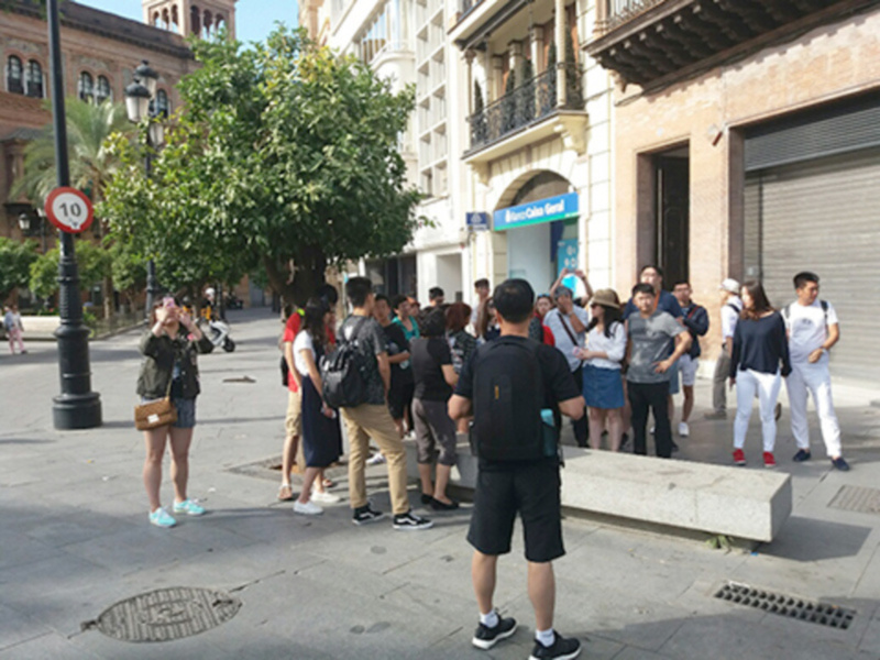 Es frecuente ver en nuestra ciudad como turistas se resguardan del los rayos del Sol bajo un árbol. En esta caso bajo un naranjo en la avenida de la Constitución. La importancia del arbolado en el pasaje urbano y su papel bioclimático toma mayor relevancia si cabe en los espacios públicos muy frecuentados por turistas.