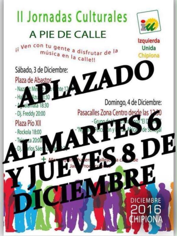 Izquierda Unida ha informado que a causa de la previsión de lluvia para este fin de semana las jornadas “Cultura a pie de calle” se posponen a los días 6 y 8 de diciembre, ambos festivos. La formación ha decidido que la programación se mantenga igual, con los conciertos en la Plaza de abastos y Pío XII el martes 6, día de la Constitución, y el jueves 8 con los pasacalles una charanga y un grupo de danza africana y percusión.