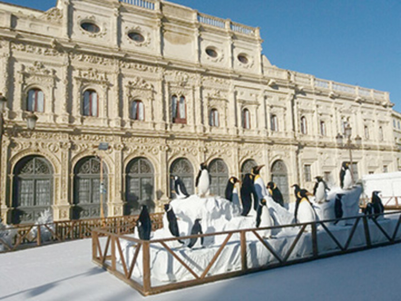 El Ayuntamiento de Sevilla ha instalado un decorado polar en la plaza de San Francisco que está teniendo gran éxito entre el público infantil. Este decorado representa un poblado de esquimales y una gran familia de pingüinos.