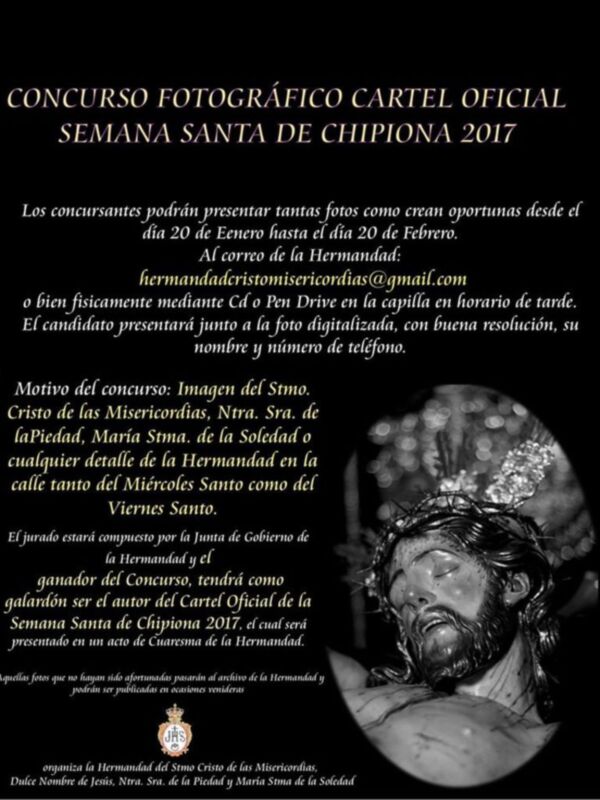 Las fotografías, que han de tener una buena resolución, se pueden enviar hasta el 20 de febrero al correo electrónico hermandadcristodelasmisericordias@gmail.com o entregarlas en formato digital en la capilla del Cristo en horario de tarde.