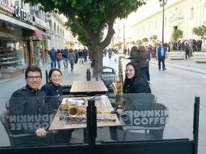La banda del Sol acompaña la la procesión. En la foto miembros de la banda del Sol descansan y recuperan fuerzas.
