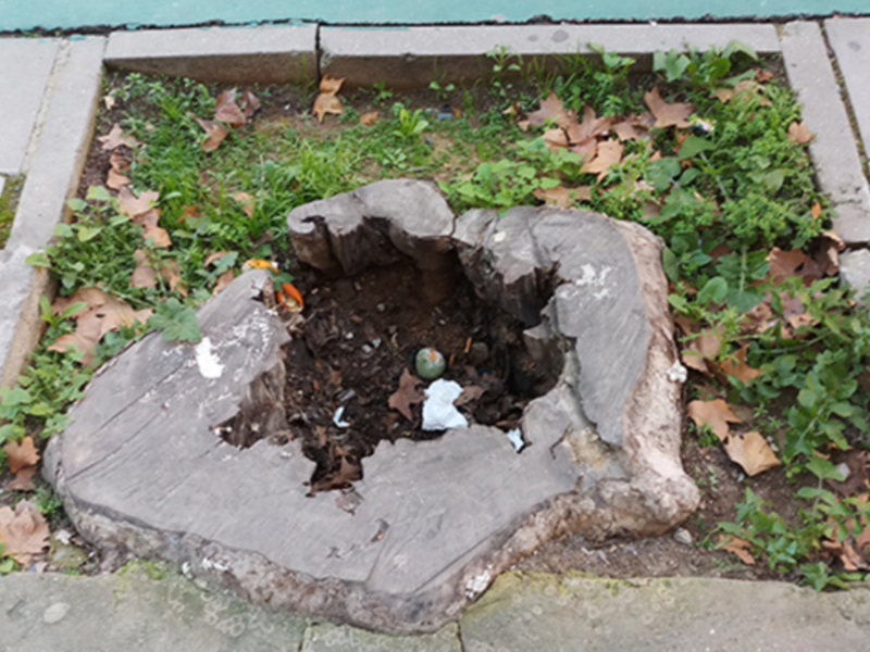 Alcorques con tocones huecos por pudrición, en plátanos de sombra en la avenida de la Cruz del Campo.