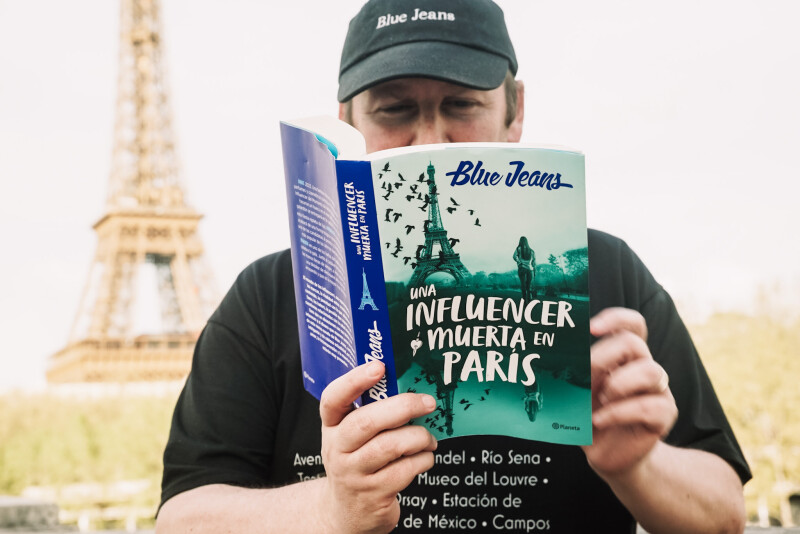 Un hombre sostiene un libro titulado "Una Influencer Muerta en Paris" de Blue Jeans, con la Torre Eiffel al fondo.