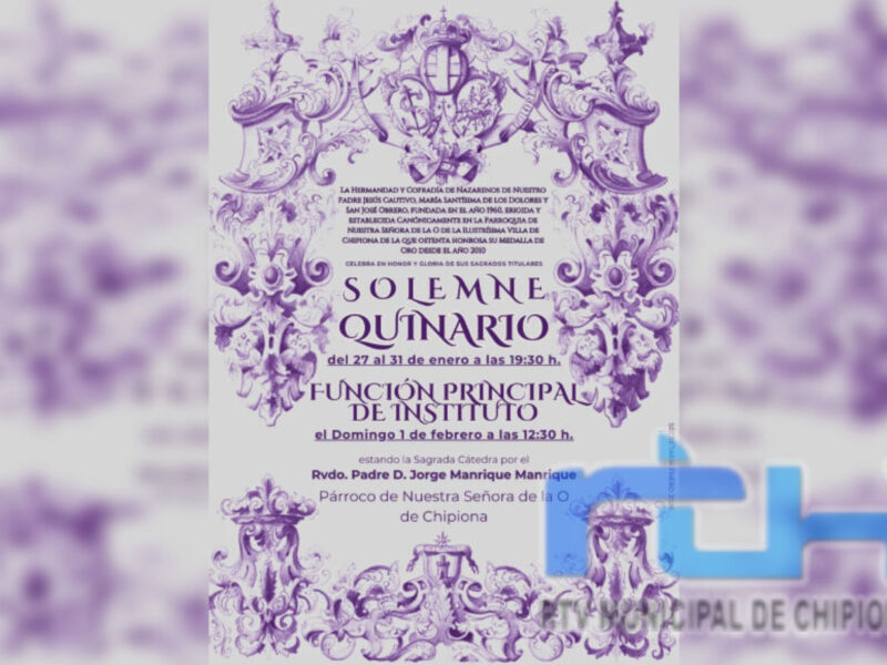 La Hermandad de Nuestro Padre Jesús Cautivo y María Santísima de los Dolores de Chipiona celebra desde ayer y hasta el  sábado 31 de enero el solemne quinario en honor a sus sagrados titulares. Los cultos tienen lugar en la Parroquia de Nuestra Señora de la O conforme a lo establecido en los estatutos de la corporación y como preparación espiritual para la Estación de Penitencia de la Semana Santa de 2026.
