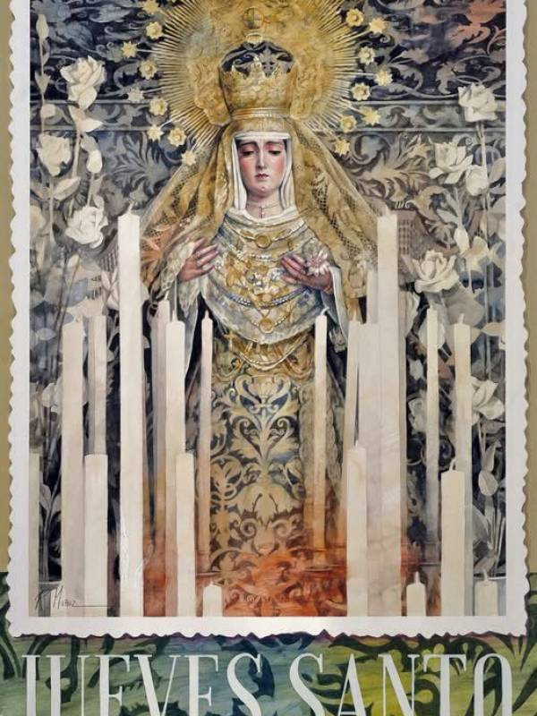 La técnica empleada, mixta sobre papel prensado en tabla con bastidor, combinando acuarela, acrílico, lápices de color y grafito, en formato de 50 x 70 cm, revela un cuidado equilibrio entre rigor documental y sensibilidad artística. La escena adquiere profundidad tridimensional bajo el palio, flanqueado por jarrones de rosales que subrayan simbólicamente la pureza de María, evocada como “rosa sin espinas” y primer sagrario de Cristo. El atuendo de la Virgen responde fielmente a la estética de comienzos del pasado siglo, con la característica soltura de los tejidos en el tocado y la abundancia de joyas que testimonian la arraigada devoción del pueblo a su Madre de las Angustias.