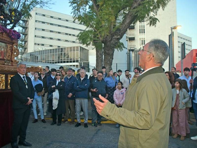 Uno de los momentos de mayor emoción tuvo lugar, como es tradición, en el tránsito del cortejo ante el Hospital Universitario Virgen Macarena, donde los titulares de la hermandad realizaron una significativa parada simbólica para llevar un mensaje de consuelo, fe y esperanza a pacientes, familiares y personal sanitario.